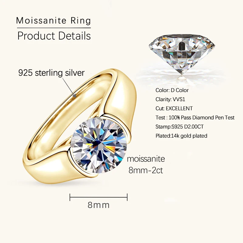 Lnngy Half Bezel 8mm 2ct Moissanite Solitiare Ring For Women Ladies 925 Sterling Silver Engagement Wedding Band With Certificate